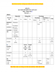 Vận dụng cao Cộng đề TNKQ TL TNKQ TL TNK TNKQ TL TL Q PHONET - Phonetics - word ICS - form Vocabulary LEXICO unit 1,2,3 - - Grammar GRAMM Gerund AR comparati ve a/an/the Questions Số câu hỏi 8 2 10 2,5 2 0,5 Số điểm (25% (20%) (5%) ) II. Life in People Reading the s of 10 câu country Viet 2,5p side Nam Số câu hỏi 5 5 10 1.25 2,5 1.25 Số điểm (12.5% (25% (12.5%) ) ) III. - Write Writing Compar a 5 câu ative passa 2,5pt - Gerund ge of