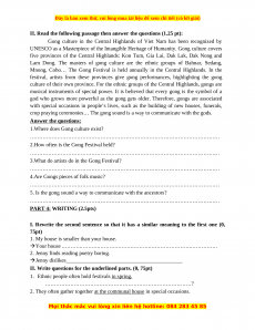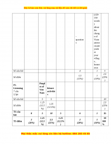 (120- 150 words ) about the chang - e of question Vietn s amese countr yside or your villag e , homet own Số câu hỏi 4 1 5 2,5 1,5 1 Số điểm (25% (15%) (10%) ) Peopl IV. es of Listening leisure Viet 7 câu activitie Nam 2,5pt s Số câu hỏi 5 5 10 1.25 2,5 1.25 Số điểm (12.5 (25% (12.5%) %) ) TS câu 8 5 10 5 6 1 35 hỏi 1.25 1.25 10 2 2,5 2 1 TS điểm (12.5 (12.5% 100 (20%) (25%) (20%) (10%) %) ) %