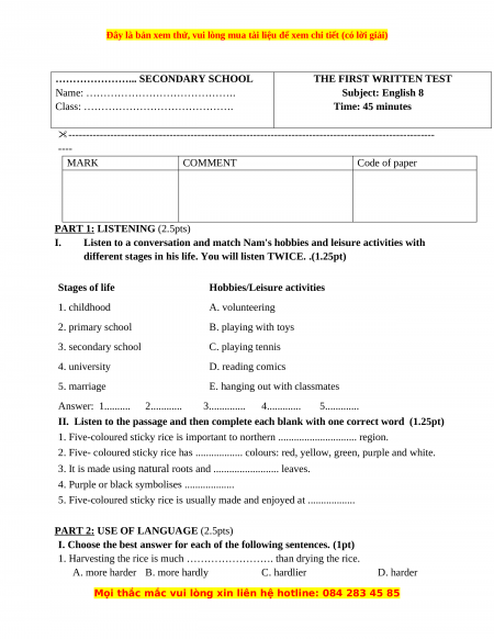 - I. Listen to a conversation and match Nam's hobbies and leisure activities with different stages in his life. You will listen TWICE. .(1.25pt)