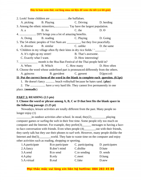 3. Among the ethnic minorities,................... Tay have the largest population. A. a B. An C. the D. Ө