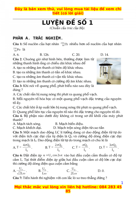 tiết (có lời giải) LUYỆN ĐỀ SỐ 1 (Chu n ẩ c u ấ trúc c a ủ B ) ộ . PHẦN A. TRẮC NGHIỆM. Câu 1: Số nuclôn c a ủ h t ạ nhân nhiều h n ơ số nuclôn c a ủ h t ạ nhân là A. 6. B. 126. C. 20. D. 14.