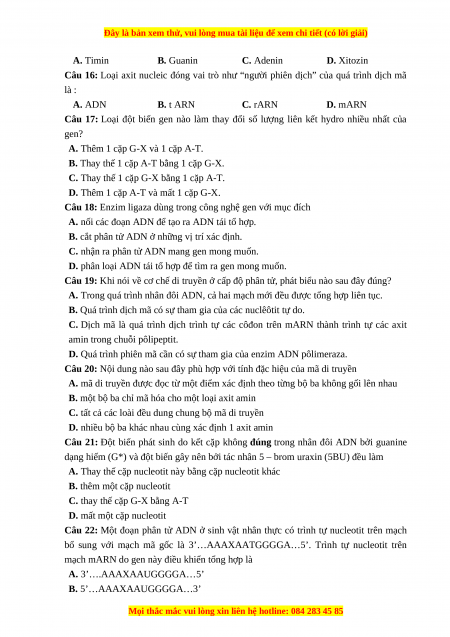Câu 21: Đột biến phát sinh do kết cặp không đúng trong nhân đôi ADN bởi guanine