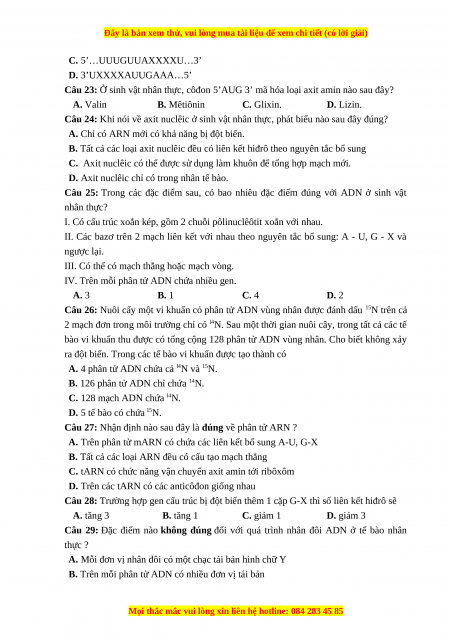 Câu 23: Ở sinh vật nhân thực, côđon 5’AUG 3’ mã hóa loại axit amin nào sau đây? A. Valin B. Mêtiônin C. Glixin. D. Lizin.