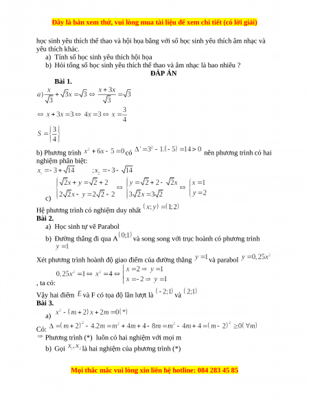 b) Hỏi tổng số học sinh yêu thích thể thao và âm nhạc là bao nhiêu ? ĐÁP ÁN Bài 1. b) Phương trình có nên phương trình có hai nghiệm phân biệt: c)
