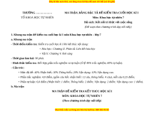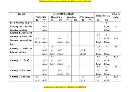 hoàn các nguyên tố hóa đi m ể ) đi m ể ) đi m ể ) đi m ể ) đi m ể ) đi m ể ) h c ọ 3 1 1 1 2 ý 4 25 Chư ng ơ II. Phân t . ử (0,75 (1 (0,25 (0,5 (1,5 (1 Liên k t ế hóa h c ọ đi m ể ) đi m ể ) đi m ể ) đi m ể ) đi m ể ) đi m ể ) 2 1 ý 1 1 ý 3 17,5 Chư ng ơ III. T c ố độ (0,5 (1 (0,25 (1 (0,75 đi m ể ) đi m ể ) đi m ể ) đi m ể ) đi m ể ) 1 1 1 ý 1 ý 2 15 Chư ng ơ IV. Âm thanh (0,25 (0,25 (1 (1 (0,5 đi m ể ) đi m ể ) đi m ể ) đi m ể ) đi m ể ) Chư ng ơ V. Ánh sáng 1 ý 3 1 ý 2 ý 3 17,5 (0,5 (0,75 (0,5 (1 (0,75