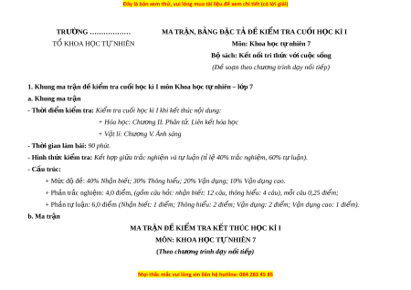 MA TRẬN, BẢNG ĐẶC TẢ Đ K Ề I M Ể TRA CU I Ố H C Ọ KÌ I TỔ KHOA H C Ọ T N Ự HIÊN Môn: Khoa h c t ọ nhi ự ên 7 B s ộ ách: K t ế n i ố tri th c v ứ i ớ cu c ộ s ng ố (Đ s ề o n t ạ heo chư ng ơ trình d y ạ n i ố ti p) ế 1. Khung ma tr n đ ậ k ề i m ể tra cu i ố h c