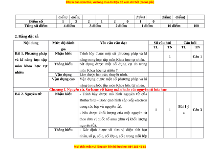 đi m ể ) đi m ể ) đi m ể ) đi m ể ) đi m ể ) Đi m ể số 1 3 2 1 2 0 1 0 T ng s ổ ố đi m ể 4 đi m ể 3 đi m ể 2 đi m ể 1 đi m ể 10 đi m ể 100 2. Bảng đặc tả N i ộ dung Mức độ đánh Yêu cầu c n đ ầ t ạ S câu h ố i ỏ Câu h i ỏ giá TL TN TL TN Bài 1. Phư ng ơ pháp Nhận bi t ế Trình bày đư c ợ m t ộ số phư ng ơ pháp và kĩ 1 Câu 1 và kĩ năng h c ọ t p ậ năng trong h c t ọ p ậ môn Khoa h c t ọ nhi ự ên. môn khoa h c ọ tự Thông hi u ể Sử d ng ụ đư c ợ m t ộ số d ng ụ cụ đo trong nhiên môn Khoa h c ọ t nhi ự ên 7. V n d ậ ng ụ Làm đư c báo ợ cáo, thuy t ế trình. Vận d ng cao ụ V n ậ d ng ụ đư c ợ m t ộ số phư ng ơ pháp và kĩ năng trong h c t ọ p ậ môn Khoa h c t ọ nhi ự ên. Chư ng ơ I. Nguyên t . S ử l ơ ư c ợ v b ề ng t ả