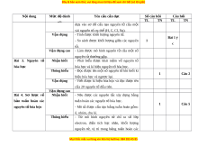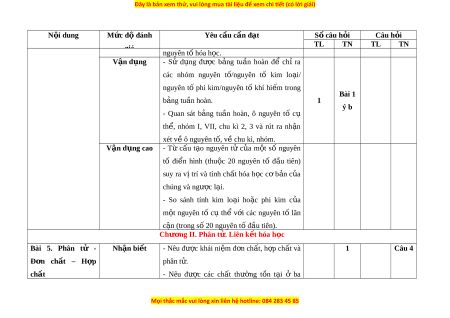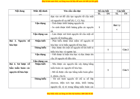 N i ộ dung Mức độ đánh Yêu cầu c n đ ầ t ạ S câu h ố i ỏ Câu h i ỏ giá TL TN TL TN d a ự vào sơ đồ c u ấ t o ạ nguyên tử c a ủ m t ộ vài nguyên tố c t ụ hể (H, C, Cl, Na). V n d ậ ng ụ - Tính đư c kh ợ i ố lư ng nguyên t ợ . ử Bài 1 ý - So sánh đư c ợ kh i ố lư ng ợ gi a ữ các nguyên 1 c t . ử Vận d ng cao ụ - Làm đư c ợ mô hình nguyên tử c a ủ m t ộ số nguyên tử thư ng ờ g p. ặ Bài 3. Nguyên tố Nhận bi t ế - Phát bi u ể đư c ợ khái ni m ệ về nguyên tố hóa h c ọ hóa h c ọ và kí hi u nguyên t ệ ố hóa h c. ọ Thông hi u ể - Đ c ọ đư c ợ tên m t ộ số nguyên t ố khi bi t ế kí 1 Câu 2 hiệu hóa h c ọ và ngư c l ợ i ạ . V n d ậ ng ụ - Vi t ế đư c ợ kí hi u ệ hóa h c ọ và đ c ọ đư c ợ tên c a