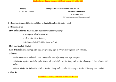 ọ kì I môn Khoa h c t ọ n ự hiên - l p ớ 7 a. Khung ma tr n ậ - Th i ờ đi m ể ki m ể tra: Ki m ể tra gi a h ữ c ọ kì I khi k t ế thúc n i ộ dung: + Hóa h c: ọ Ch đ ủ ề 3: Phân tử + V t ậ lí: Chủ đ 6 ề : Ánh sáng + Sinh h c: ọ Ch đ ủ 9: ề C m ả ng ứ s ở inh v t ậ - Th i