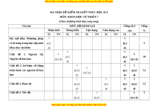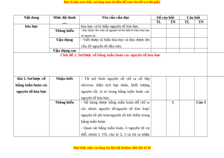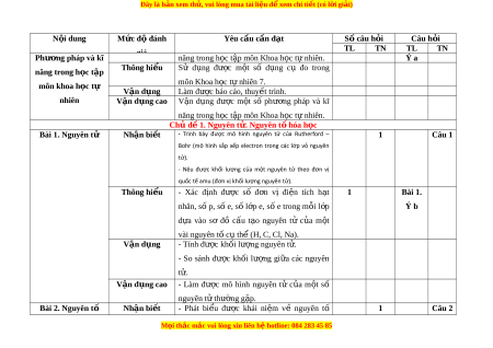 ệ đ xe ể m chi ti t (c ế ó lời gi i ả ) N i ộ dung Mức độ đánh Yêu cầu c n đ ầ t ạ Số câu h i ỏ Câu h i ỏ giá TL TN TL TN Phư ng ơ pháp và kĩ năng trong h c ọ t p m ậ ôn Khoa h c ọ t nhi ự ên. Ý a năng trong h c t ọ p ậ Thông hi u ể Sử d ng ụ đư c ợ m t ộ số d ng ụ cụ đo trong môn khoa h c ọ tự môn Khoa h c t ọ nhi ự ên 7. V n d ậ ng ụ Làm đư c ợ báo cáo, thuy t ế trình. nhiên V n d ậ ng cao ụ V n ậ d ng ụ đư c ợ m t ộ số phư ng ơ pháp và kĩ năng trong h c ọ t p m ậ ôn Khoa h c ọ t nhi ự ên. Chủ đ 1. N ề guyên t . N ử guyên t h ố óa h c ọ Bài 1. Nguyên tử Nhận bi t ế