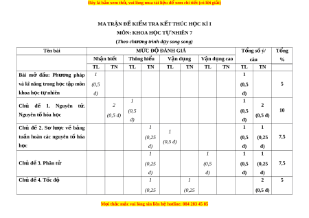 MA TRẬN ĐỀ KIỂM TRA KẾT THÚC H C Ọ KÌ I MÔN: KHOA H C Ọ TỰ NHIÊN 7 (Theo chư ng t ơ rình d y s ạ ong song) Tên bài M C Ứ Đ Đ Ộ ÁNH GIÁ T ng s ổ ố ý/ T ng ổ Nhận bi t ế Thông hi u ể V n d ậ ng ụ Vận d ng cao ụ câu % TL TN TL TN TL TN TL TN TL TN đi m ể Bài mở đ u ầ : Phư ng ơ pháp 1 1 và kĩ năng trong h c ọ t p ậ môn (0,5 (0,5 5 khoa h c ọ t nhi ự ên đ) đ) 1 1