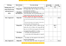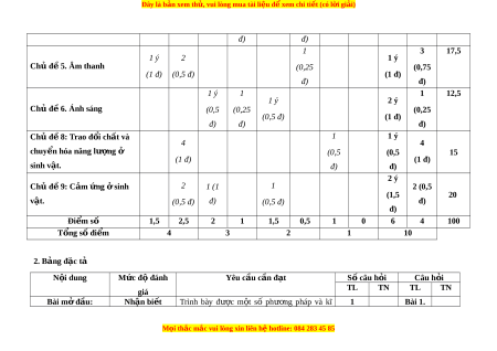 ệ đ xe ể m chi ti t (c ế ó lời gi i ả ) đ) đ) 1 3 17,5 1 ý 2 1 ý Chủ đ 5. Â ề m thanh (0,25 (0,75 (1 đ) (0,5 đ) (1 đ) đ) đ) 1 ý 1 1 12,5 1 ý 2 ý Chủ đ 6. Á ề nh sáng (0,5 (0,25 (0,25 (0,5 đ) (1 đ) đ) đ) đ) Chủ đ 8: ề Trao đ i ổ ch t ấ và 1 1 ý 4 4 chuy n h ể óa năng lư ng ợ ở (0,5 (0,5 15 (1 đ) (1 đ) sinh v t ậ . đ) đ) 2 ý Chủ đ 9: ề C m ả ng ứ s ở inh 2 1 (1 1 2 (0,5 (1,5 20 v t ậ . (0,5 đ) đ) (0,5 đ) đ) đ) Đi m ể số 1,5 2,5 2 1 1,5 0,5 1 0 6 4 100 T ng s ổ ố đi m ể 4 3 2 1 10 2. Bảng đặc tả N i ộ dung Mức độ đánh Yêu cầu c n đ ầ t ạ Số câu h i ỏ Câu h i ỏ giá TL TN TL TN Bài m đ ở ầu: Nhận bi t ế Trình bày đư c ợ m t ộ số phư ng ơ pháp và kĩ 1 Bài 1. M i
