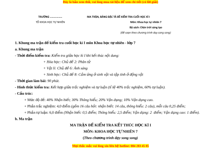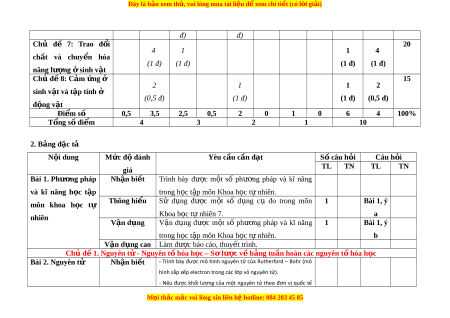 Chủ đề 7: Trao đ i ổ 20 4 1 1 4 ch t ấ và chuy n ể hóa (1 đ) (1 đ) (1 đ) (1 đ) năng lư ng ợ ở sinh v t ậ Chủ đ 8: ề C m ả ng ứ ở 15 2 1 1 2 sinh v t ậ và t p t ậ ính ở (0,5 đ) (1 đ) (1 đ) (0,5 đ) đ ng v ộ t ậ Đi m ể số 0,5 3,5 2,5 0,5 2 0 1 0 6 4 100% T ng s ổ ố đi m ể 4 3 2 1 10 2. Bảng đặc tả N i ộ dung Mức đ đánh ộ Yêu cầu c n đ ầ t ạ S câu h ố i ỏ Câu h i ỏ giá TL TN TL TN Bài 1. Phư ng ơ pháp Nhận bi t ế Trình bày đư c ợ m t ộ số phư ng ơ pháp và kĩ năng và kĩ năng h c ọ t p ậ trong h c ọ t p m ậ ôn Khoa h c ọ t nhi ự ên. môn khoa h c ọ tự Thông hi u ể Sử d ng ụ đư c ợ m t ộ số d ng ụ cụ đo trong môn 1 Bài 1, ý nhiên Khoa h c t ọ ự nhiên 7. a Vận d ng ụ V n ậ d ng ụ đư c ợ m t ộ số phư ng ơ pháp và kĩ năng 1 Bài 1, ý trong h c ọ t p m ậ ôn Khoa h c ọ t nhi ự ên. b Vận d ng cao ụ Làm đư c ợ báo cáo, thuy t ế trình. Chủ đ 1. N ề guyên t - ử Nguyên t hóa h ố c – S ọ l ơ ư c ợ v b ề ng t ả