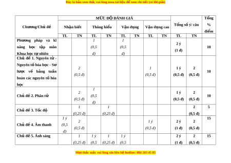 ệ đ xe ể m chi ti t (c ế ó lời gi i ả ) M C Ứ Đ Đ Ộ ÁNH GIÁ T ng ổ T ng s ổ ố ý/ câu % Chư ng/ ơ Ch đ ủ ề Nhận bi t ế Thông hi u ể V n d ậ ng ụ V n d ậ ng cao ụ đi m ể TL TN TL TN TL TN TL TN TL TN Phư ng ơ pháp và kĩ 1 1 2 ý năng h c ọ t p ậ môn (0,5 (0,5 10 (1 đ) Khoa h c t ọ nhi ự ên đ) đ)