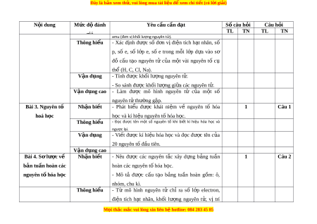 amu (đơn vị khối lượng nguyên tử). Thông hi u ể - Xác đ nh ị đư c ợ số đ n ơ vị đi n ệ tích h t ạ nhân, số p, số e, số l p ớ e, số e trong m i ỗ l p ớ d a ự vào sơ đồ cấu t o ạ nguyên tử c a ủ m t ộ vài nguyên tố cụ th ( ể H, C, Cl, Na). Vận d ng ụ - Tính đư c ợ kh i ố lư ng ợ nguyên t . ử - So sánh đư c kh ợ ối lư ng gi ợ a ữ các nguyên t . ử Vận d ng cao ụ - Làm đư c ợ mô hình nguyên tử c a ủ m t ộ số nguyên t t ử hư ng g ờ p. ặ Bài 3. Nguyên tố Nhận bi t ế - Phát bi u ể đư c ợ khái ni m ệ về nguyên tố hóa 1 Câu 1 hoá h c ọ h c và kí ọ