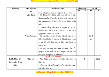 - Đọc được tên một số nguyên tố khi biết kí hiệu hóa học và ngược lại. Vận d ng ụ - Vi t ế đư c ợ kí hi u ệ hóa h c ọ và đ c ọ đư c ợ tên c a ủ 20 nguyên tố đầu tiên. Vận d ng cao ụ Bài 4. S l ơ ư c v ợ ề Nhận bi t ế - Nêu đư c ợ các nguyên t c ắ xây d ng ự b ng ả tu n ầ 1 Câu 2 bản tuần hoàn các