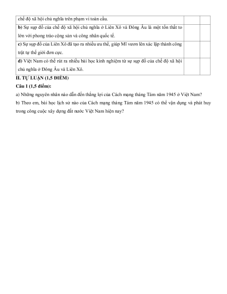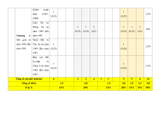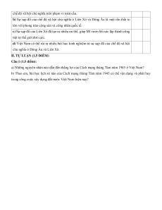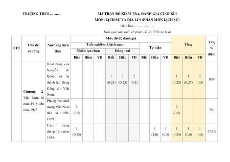 năm 1918 đến mạng Việt Nam 2 2 năm 1945 5% thời kì 1930- (0,5) (0,5) 1939 Cách mạng 1 1 1 1 1 1 tháng Tám năm 17,5% (0,25) (1,0) (0,5) (0,25) (1,0) (0,5) 1945. Chiến tranh 1 1 lạnh (1947- 2,5% (0,25) (0,25) 1989) Liên Xô và Đông Âu từ 1 1 2 1 1 2 10% năm 1945 đến (0,25) (0,25) (0,5) (0,25) (0,25) (0,5) Chương 3. năm 1991