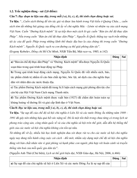 Câu 7: Đọc đoạn tư liệu sau đây, trong mỗi ý a), b), c), d), thí sinh chọn đúng hoặc sai.