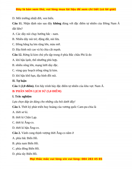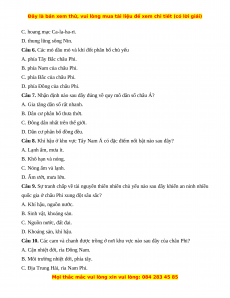 Câu 8. Khí hậu ở khu vực Tây Nam Á có đặc điểm nổi bật nào sau đây? A. Lạnh ẩm, mưa ít. B. Khô hạn và nóng. C. Nóng ẩm và lạnh. D. Ẩm ướt, mưa lớn.
