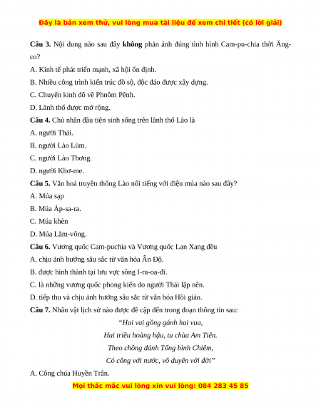 Câu 4. Chủ nhân đầu tiên sinh sống trên lãnh thổ Lào là A. người Thái. B. người Lào Lùm. C. người Lào Thơng. D. người Khơ-me.