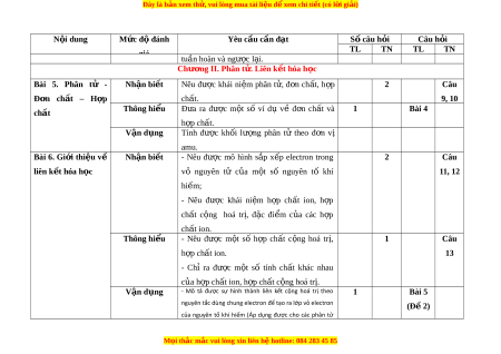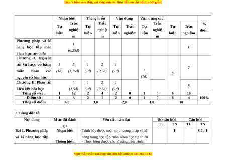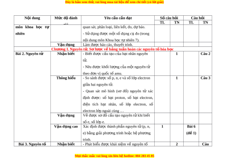 Đây là bản xem th , vu ử i lòng mua tài li u ệ đ xe ể m chi ti t ế (có l i ờ gi i ả ) N i ộ dung Mức độ đánh Yêu cầu c n đ ầ t ạ S câu h ố i ỏ Câu h i ỏ giá TL TN TL TN môn khoa h c ọ tự quan sát, phân lo i ạ , liên k t ế , đo, d báo. ự nhiên - S d ử ng đ ụ ư c ợ m t ộ số d ng c ụ đo ( ụ trong n i ộ dung môn Khoa h c t ọ nhi ự ên 7). V n d ậ ng ụ Làm đư c báo ợ cáo, thuy t ế trình. Chư ng ơ I. Nguyên t . S ử l ơ ư c ợ v b ề ng t ả