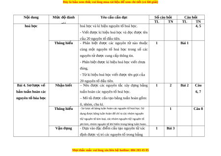 Đây là bản xem th , vu ử i lòng mua tài li u ệ đ xe ể m chi ti t ế (có l i ờ gi i ả ) N i ộ dung Mức độ đánh Yêu cầu c n đ ầ t ạ S câu h ố i ỏ Câu h i ỏ giá TL TN TL TN hoá h c ọ hoá h c ọ và kí hi u nguyên t ệ ố hoá h c. ọ 4, 5 - Vi t ế đư c ợ kí hi u hoá h ệ c ọ và đ c đ ọ ư c t ợ ên c a