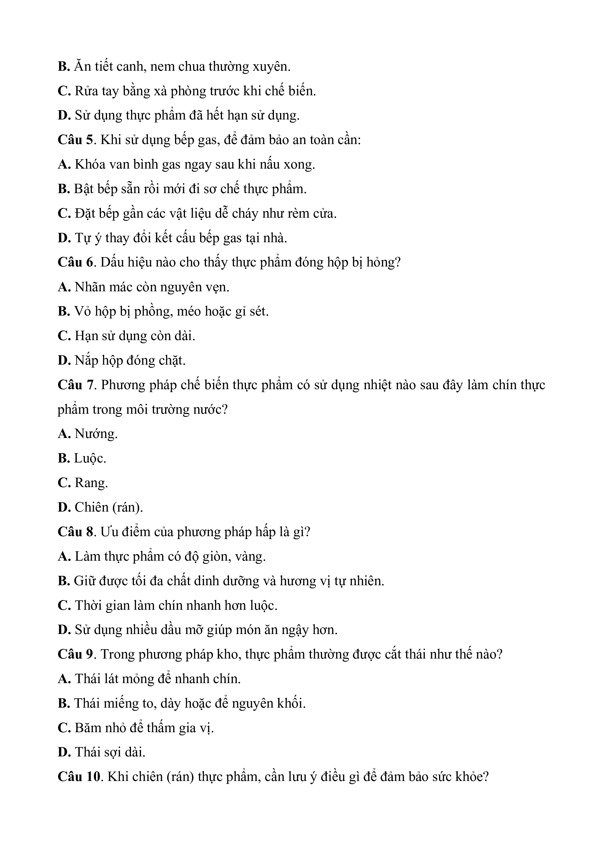 Câu 9. Trong phương pháp kho, thực phẩm thường được cắt thái như thế nào?