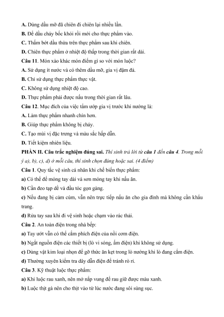 Câu 2. Nhiệt độ "nguy hiểm" khiến vi khuẩn phát triển nhanh nhất trong thực phẩm là: A. 5°C - 60°C. B. Dưới 0°C. C. Trên 100°C. D. 70°C - 80°C.