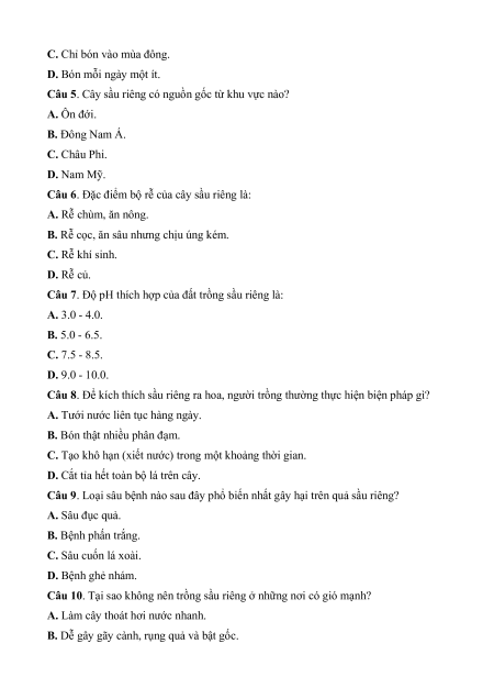 Câu 7. Độ pH thích hợp của đất trồng sầu riêng là: A. 3.0 - 4.0. B. 5.0 - 6.5. C. 7.5 - 8.5. D. 9.0 - 10.0.