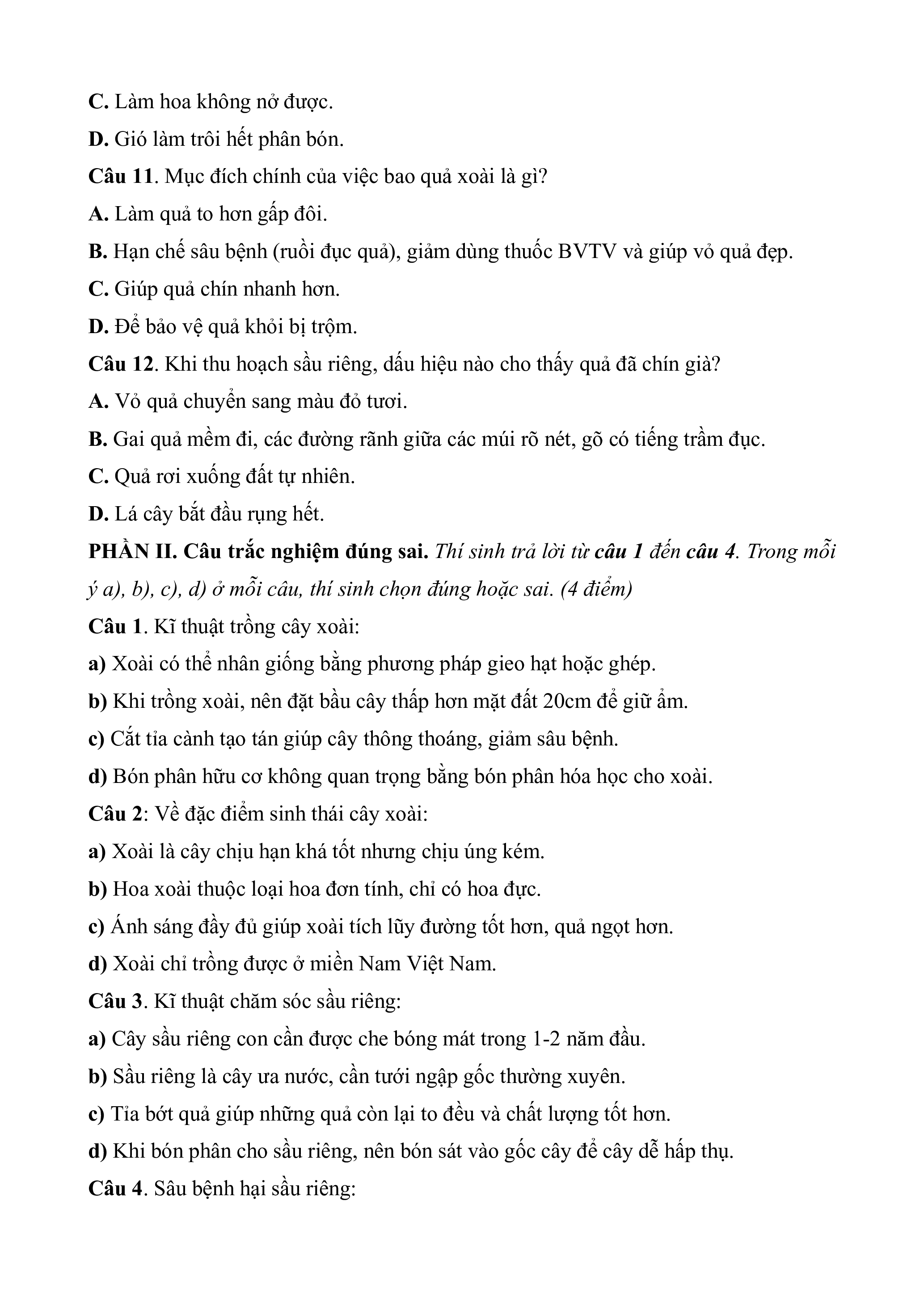 Câu 5. Cây sầu riêng có nguồn gốc từ khu vực nào? A. Ôn đới. B. Đông Nam Á. C. Châu Phi. D. Nam Mỹ.