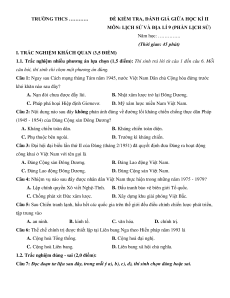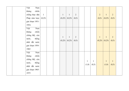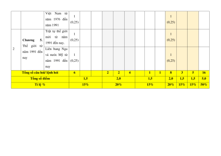 năm 1945 đến tháng 12/1946) năm 1991 Việt Nam kháng chiến chống thực dân 1 1 Pháp xâm lược (0,25) (0,25) giai đoạn 1946- 1950. Việt Nam kháng chiến chống thực dân 1 1 1 2 2 1 2 Pháp xâm lược (0,25) (0,25) (0,25) (0,5) (0,5) (0,25) (0,5) giai đoạn 1951- 1954. Việt Nam kháng chiến chống Mỹ, cứu 1 1 2 1 1 2 nước, thống (0,25) (0,25) (0,5) (0,25) (0,25) (0,5) nhất đất nước giai đoạn 1954- 1965 Việt Nam kháng chiến chống Mỹ, cứu 1 1 1 1 nước, thống (1,0) (0,5) (1,0) (0,5) nhất đất nước giai đoạn 1965- 1975 Việt Nam từ 1 1 năm 1976 đến (0,25) (0,25) năm 1991 Trật tự thế giới 1 1 mới từ năm Chương 5. (0,25) (0,25) 1991 đến nay. Thế giới từ 2 Liên bang Nga