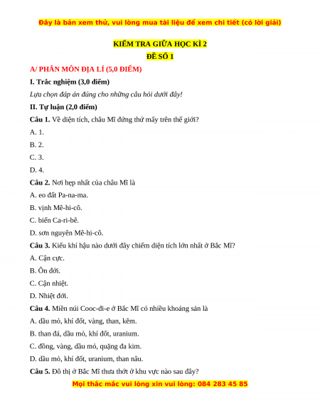 Câu 1. Về diện tích, châu Mĩ đứng thứ mấy trên thế giới? A. 1. B. 2. C. 3. D. 4.