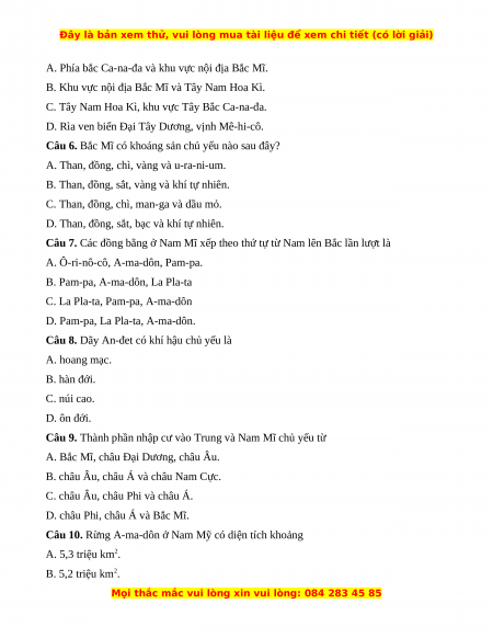 Câu 12. Vùng đồng bằng A-ma-dôn có thảm thực vật chủ yếu nào sau đây? A. Rừng mưa nhiệt đới. B. Rừng xích đạo ẩm. C. Cảnh quan rừng thưa.