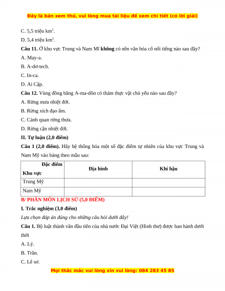 Câu 10. Rừng A-ma-dôn ở Nam Mỹ có diện tích khoảng A. 5,3 triệu km2. B. 5,2 triệu km2.
