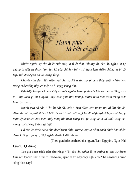 lam, ích kỷ của chính mình”. Theo em, quan điểm này có ý nghĩa như thế nào trong cuộc sống hiện nay? Câu 2. (4,0 điểm)