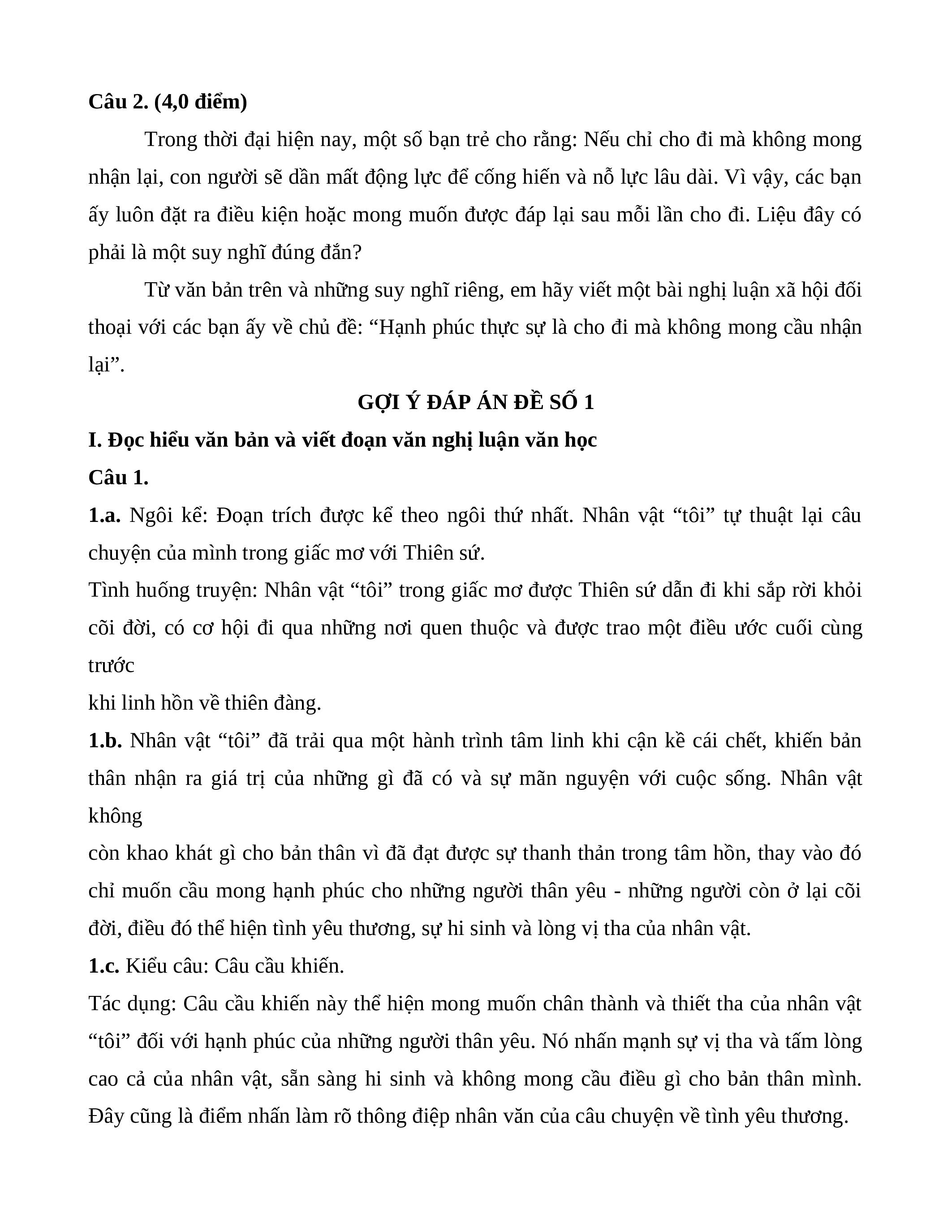 I. Đọc hiểu văn bản và viết đoạn văn nghị luận văn học Câu 1.