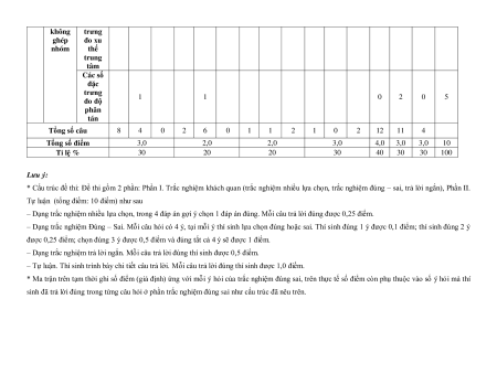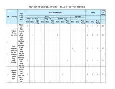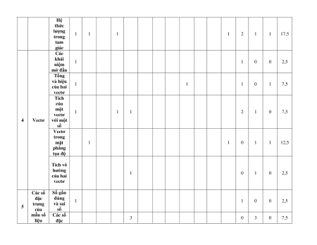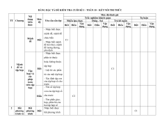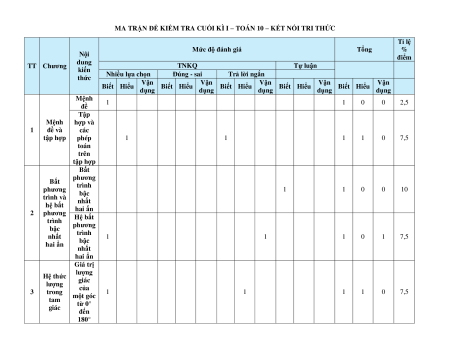 Mức độ đánh giá Tổng % Nội điểm dung TT Chương TNKQ Tự luận kiến Nhiều lựa chọn Đúng - sai Trả lời ngắn thức Vận Vận Vận Vận Vận Biết Hiểu Biết Hiểu Biết Hiểu Biết Hiểu Biết Hiểu dụng dụng dụng dụng dụng Mệnh đề 1 1 0 0 2,5 Tập Mệnh hợp và 1 đề và các tập hợp phép 1 1 1 1 0 7,5 toán trên tập hợp Bất phương Bất phương trình 1 1 0 0 10 bậc trình và nhất hệ bất hai ẩn 2 phương Hệ bất trình phương bậc trình nhất 1 1 1 0 1 7,5 bậc hai ẩn nhất hai ẩn Giá trị lượng Hệ thức lượ giác ng của 3 trong 1 1 1 1 0 7,5 một góc tam từ 0° giác đến 180° Hệ thức lượng 1 1 1 1 2 1 1 17,5 trong tam giác Các khái 1 1 0 0 2,5 niệm mở đầu Tổng và hiệu 1 1 1 0 1 7,5 của hai vectơ Tích của một vectơ 1 1 1 2 1 0 7,5 4 Vectơ với một số Vectơ trong mặt 1 1 0 1 1 12,5 phẳng tọa độ Tích vô hướng 1 0 1 0 2,5 của hai vectơ Các số Số gần đặc đúng trưng 1 1 0 0 2,5 và sai 5 của số mẫu số Các số 3 0 3 0 7,5 liệu đặc không trưng ghép đo xu nhóm thế trung tâm Các số đặc trưng đo độ 1 1 0 2 0 5 phân tán Tổng số câu 8 4 0 2 6 0 1 1 2 1 0 2 12 11 4 Tổng số điểm 3,0 2,0 2,0 3,0 4,0 3,0 3,0 10 Tỉ lệ % 30 20 20 30 40 30 30 100 Lưu ý: