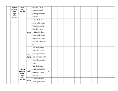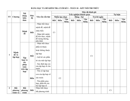 Yêu cầu cần đạt Nhiều lựa chọn Đúng - Sai Trả lời ngắn kiến độ Vận Vận Vận Vận thức Biết Hiểu Biết Hiểu Biết Hiểu Biết Hiểu dụng dụng dụng dụng - Nhận biết được mệnh đề, mệnh đề Mệnh chứa biến đề Biết C1 - Nhận biết mệnh đề kéo theo, mệnh đề tương đương, phủ định - Nhận biết được phần tử thuộc hoặc không thuộc Mệnh tập hợp 1 đề và Biết C1 tập hợp Tập - Liệt kê các phần hợp và tử của một tập hợp các phép - Xác định tập con toán của tập hợp số cho trên tập trước hợp - Tìm số tập hợp con của tập hợp số Hiểu cho trước C2 - Tìm phần giao, hợp, phần bù của hai tập hợp số 2 Bất Bất Nhận biết được