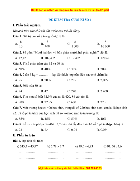Câu 8. Số dư của phép chia 468 : 3,7 (nếu chỉ lấy đến hai chữ số ở phần thập phân) là: A. 24 B. 2,4 C. 0,24 D. 0,024 II. Phần tự luận