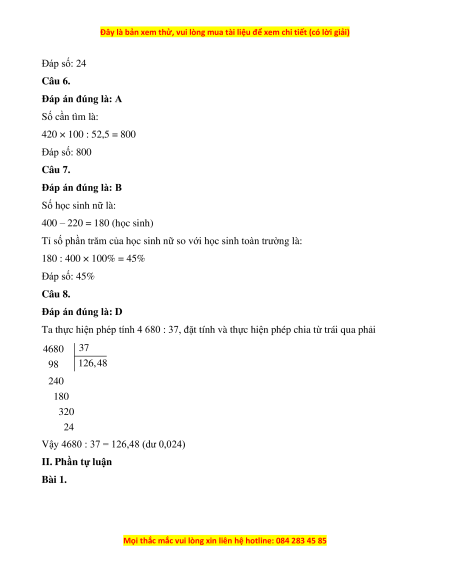 Vậy 4680 : 37 = 126,48 (dư 0,024) II. Phần tự luận Bài 1.