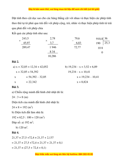 Bài 1. Đặt tính rồi tính: a) 243,5 + 45,97 b) 2,78 × 3,7 c) 79,6 – 6,83 d) 91, 08 : 3,6 …………… …………… …………… …………… …………… …………… …………… ……………