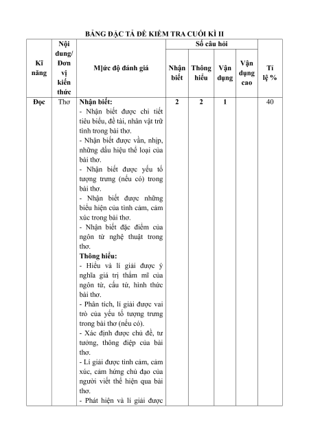 BANG ĐĂC TA ĐỀ KIỂM TRA CUỐI KÌ II Nội Sô câu hoi dung/ Kĩ Đơn Vận năng vị Mức độ đánh giá Nhận Thông Vận Tỉ dụng kiến biết hiểu dụng lệ % cao thức Đọc Thơ Nhận biết: 2 2 1 40