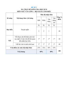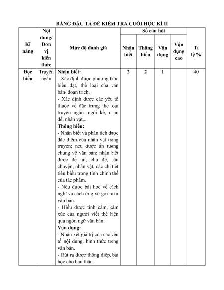 Nội dung/ đơn vị kĩ năng Tổng % Vận điểm Biết Hiểu Vận dụng dụng cao TL TL TL TL Đọc hiểu Truyện ngắn 2 2 1 40