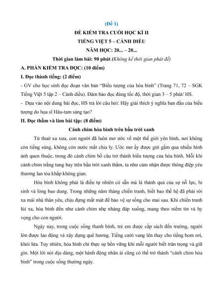 Bộ 20 đề thi Cuối kì 2 Tiếng Việt lớp 5 Cánh diều có đáp án