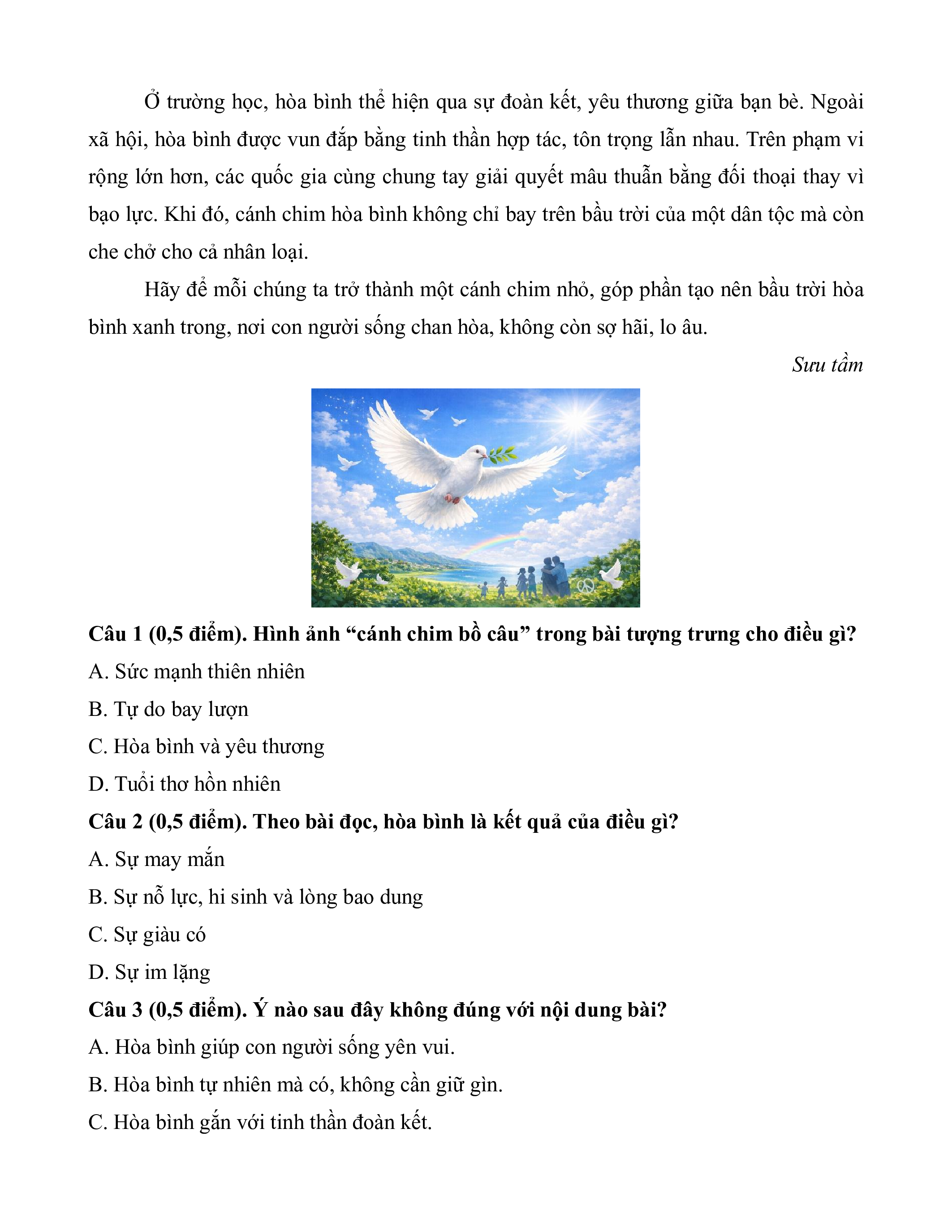 Câu 2 (0,5 điểm). Theo bài đọc, hòa bình là kết quả của điều gì? A. Sự may mắn