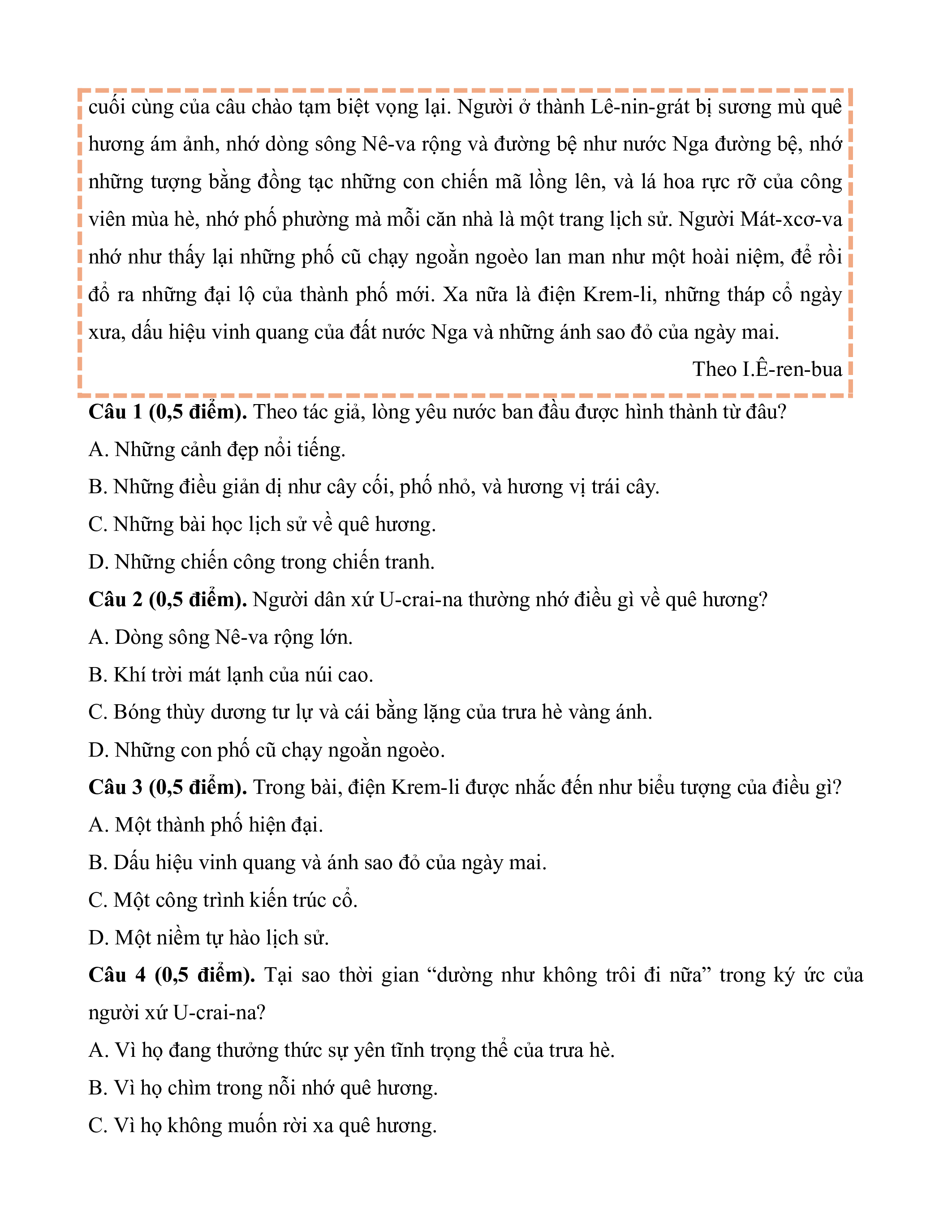 Câu 2 (0,5 điểm). Người dân xứ U-crai-na thường nhớ điều gì về quê hương?
