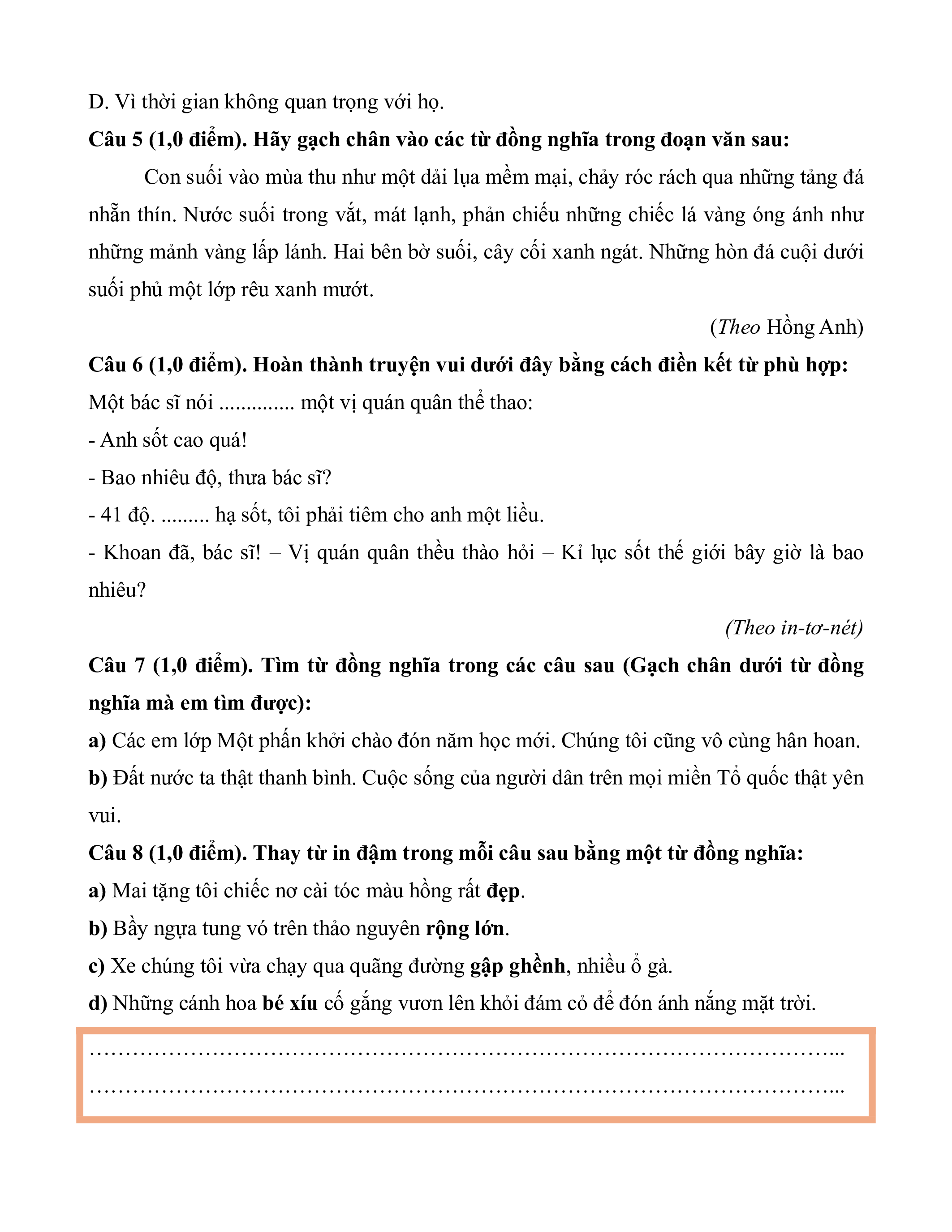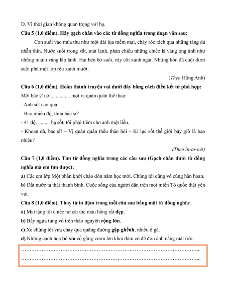 Câu 5 (1,0 điểm). Hãy gạch chân vào các từ đồng nghĩa trong đoạn văn sau: