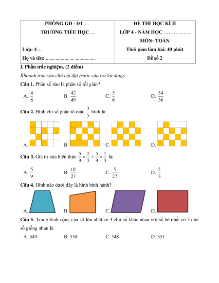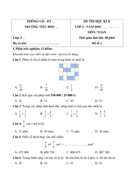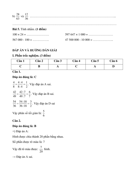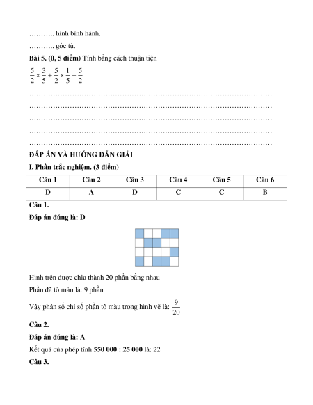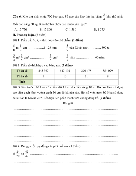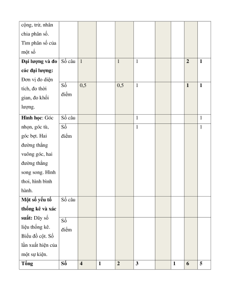 tròn số tự nhiên. điểm Các phép tính với số tự nhiên. Nhân (chia) với 10, 100, 1 000,... Nhân (chia) với số có 2 chữ số. Tìm số trung bình cộng. Bài toán liên quan đến rút về đơn vị. Phân số và Số câu 1 1 1 2 1 phép tính: Tính chất cơ bản của phân số. Rút gọn Số 0,5 0,5 0,5 1 0,5 phân số. Quy điểm đồng mẫu số các phân số. So sánh phân số. Phép cộng, trừ, nhân chia phân số. Tìm phân số của một số