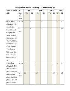 Năng lực, phẩm Số Mức 1 Mức 2 Mức 3 Tổng chất câu, TN TL TN TL TN TL TN TL số điểm Số và phép Số câu 2 1 1 2 2 tính: Đọc, viết, so sánh, làm Số 1 2 2,5 1 4,5