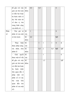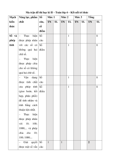 Mạch Năng lực, phẩm Số Mức 1 Mức 2 Mức 3 Tổng kiến chất câu, TN TL TN TL TN TL TN TL thức số điểm Số và – Thực hiện Số 1 1 phép được phép nhân câu tính với các số có Số 1 1 không quá hai điểm chữ số. – Thực hiện được phép chia cho số có không quá hai chữ số. – Vận dụng Số 1 1 được tính chất câu của phép tính Số 1 1 (giao hoán, kết điểm hợp, phân phối) để tính nhẩm và tính bằng cách thuận tiện nhất. – Thực hiện được phép nhân với 10; 100; 1000;... và phép chia cho 10; 100; 1000;... – Giải quyết Số 1 1 2